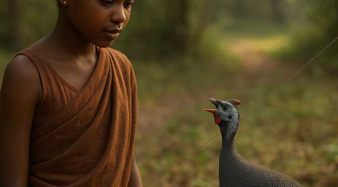 There upon said the little boy, “I have come to look at my father’s line.” And the guinea-fowl said, “Go and tell your father that I will bring a white chicken and a white sheep and a white bead if he will let me go.”