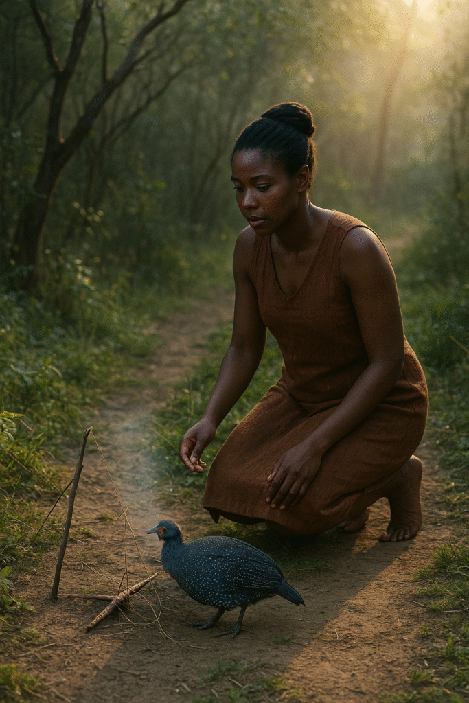 Then said the girl, “I have come to look at the snare.” And the guinea-fowl asked her, “Whose snare is it?” And the girl said, “I have come to look at my father’s snare.” Thereupon the guinea-fowl said to her, “Go and tell your father that I will bring a white bead and a white sheep if he will let me go.”