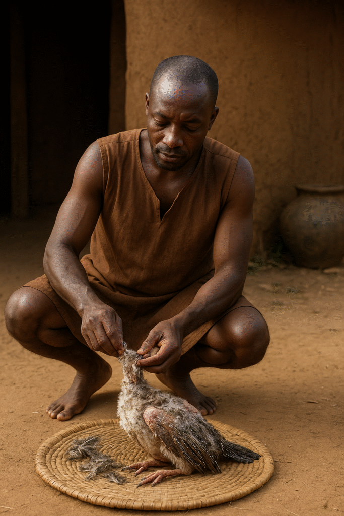 The man then brought him home and plucked him. As he did this, the guinea-fowl said to him, “Though you pluck me, pluck me: here in the evening I shall pluck mine.”
