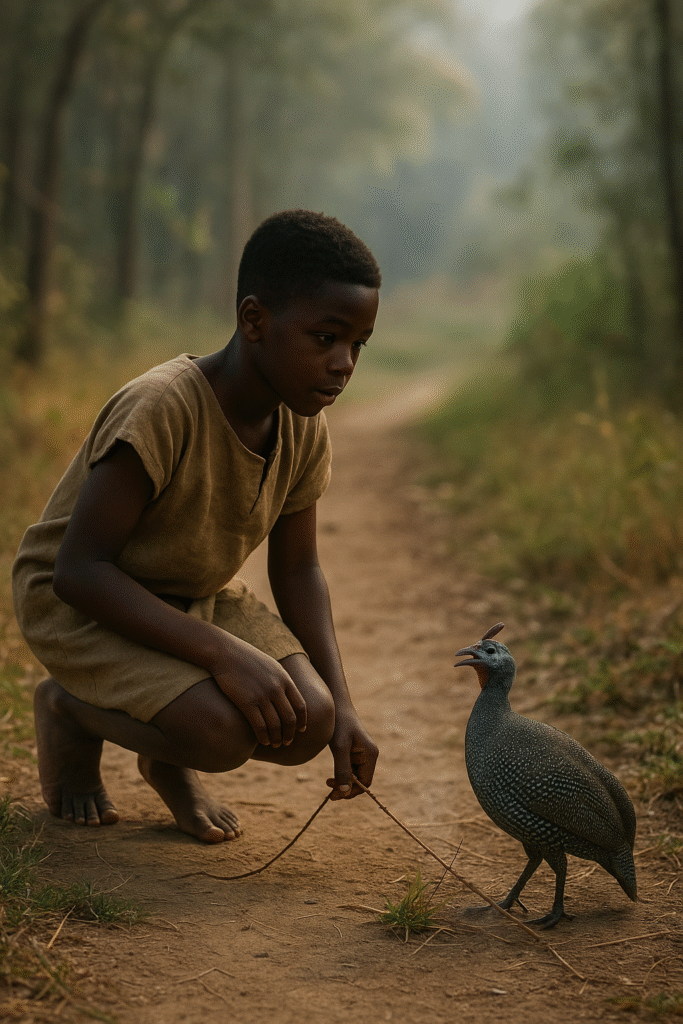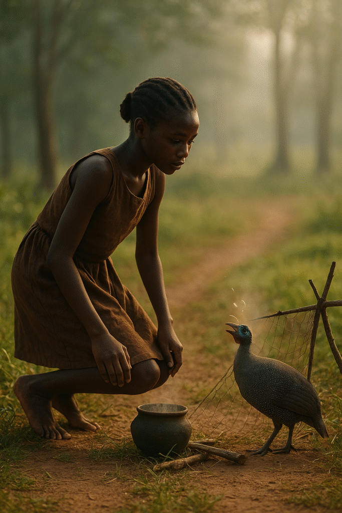 A CERTAIN MAN Once upon a time set his bird line and sent his daughter, saying, “Go and look at my line while I go to dig.” So his daughter went to see the line. She found a guinea-fowl caught in it, and the guinea-fowl sang:
